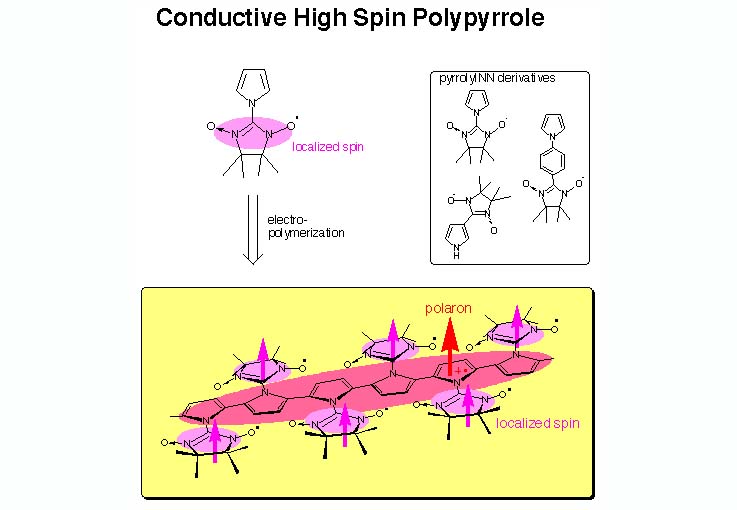 ピロールに安定ラジカルを持たせた場合、このピロール部分は重合反応性を持つことが期待されますから、重合により、このように多くのラジカル部位を持ったポリピロールが得られると考えられます。この場合、ポリピロール鎖上に生ずるポーラロンを介して多くの局在スピンがそろうようになると考えられます。うまくすれば、このポリピロール部分が伝導性を持つこともできます。